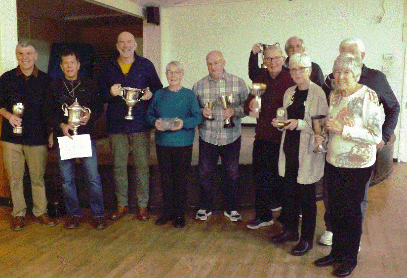 A presentation evening for those bowls members who had won (or come Runner-up) in the clubs 2025 bowls competitions was held at the Prattens Sports and Social club last week. The above picture is of those who qualified and could attend (Alan, Gus, Martin, Chris, Dave, Colin, Graeme, Pauline, Caryl and Brian. Those who could not attend were Linda, Phil, Shirley and Steve – my apologies if I have missed anyone. Before the presentation took place all present, including friends and family, had a very enjoyable meal consisting of either Fish and Chips or Sausage and Chips with Mushy peas and curry sauce. There was also a game of Killer Skittles played with everyone present taking part. This proved to be very competitive but, as usual, this was won by a Mr. Fear but this year by Rob Fear rather the winner of the previous two years who was Alan Fear. Thanks go to Alan Fear for organising the evening but also to those who prepared the tables, sold the raffle tickets and all of the other various tasks without which an evening of this nature cannot take place.